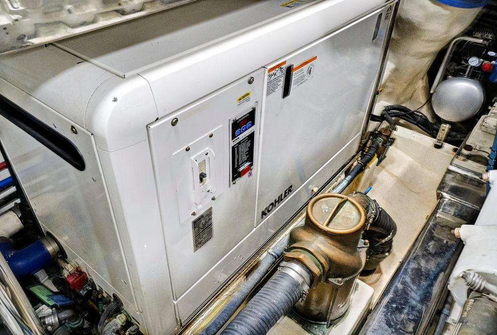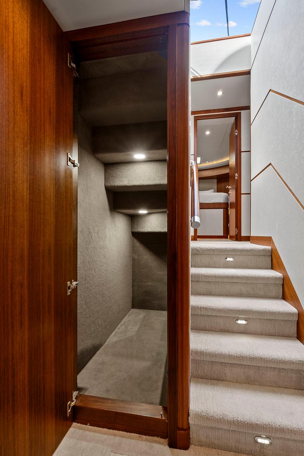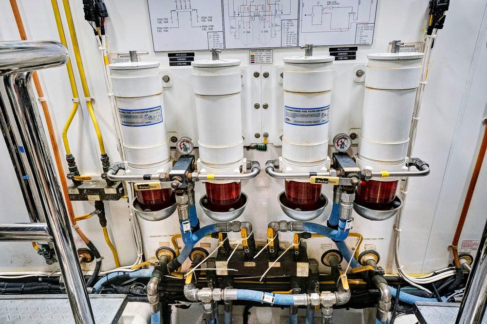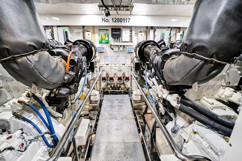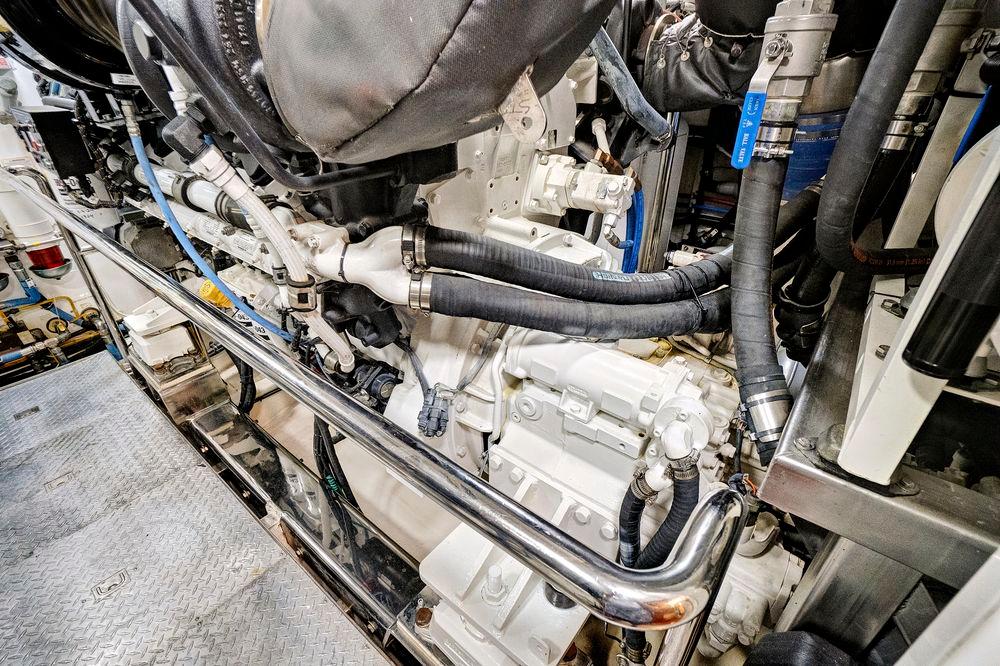 Aft of the vessel is a very nicely appointed and well-equipped crew quarters. As you enter down the stairs through the aft cockpit there is a separate washer/dryer and yacht monitoring systems. At the bottom of the staircase is a crew mess hall galley. On the starboard side there are two staterooms one for the captain and another for two more crew members. A full-size head with shower allows the crew to have all the comforts of home. Forward of the crew is the engine room that is neat, clean, and organized with all services up to date as of September 2024. Note that aft of engine room and crew there is a water tight door that enters to a clean lazarette area that goes out to the swim platform, so crew can come and go without having to enter the topside aft deck for ultimate owner privacy.