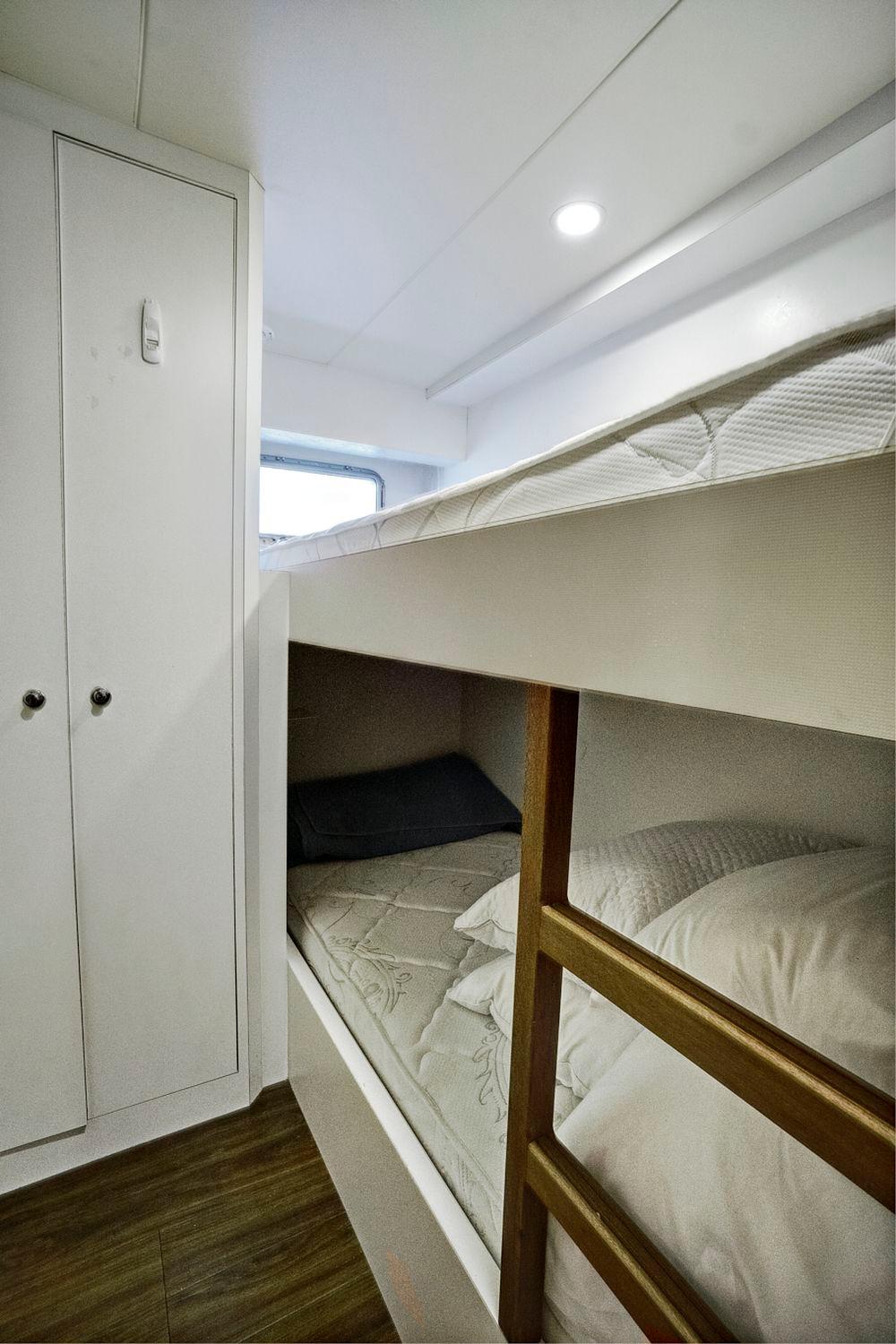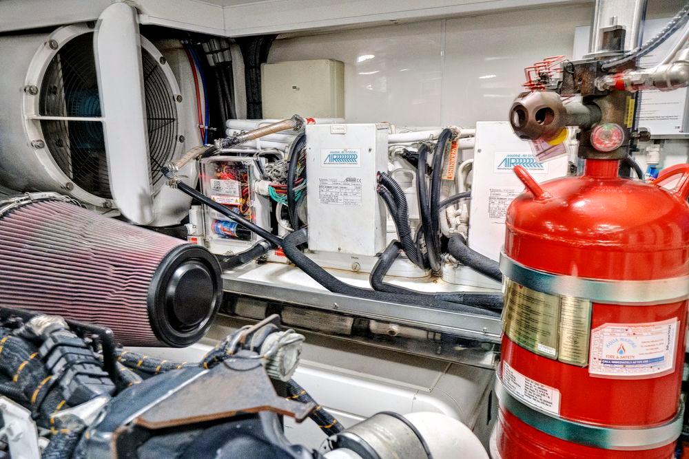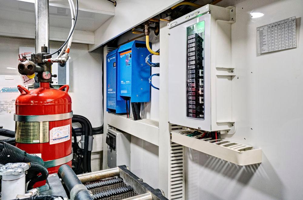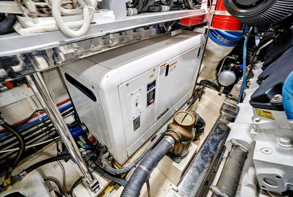 Aft of the vessel is a very nicely appointed and well-equipped crew quarters. As you enter down the stairs through the aft cockpit there is a separate washer/dryer and yacht monitoring systems. At the bottom of the staircase is a crew mess hall galley. On the starboard side there are two staterooms one for the captain and another for two more crew members. A full-size head with shower allows the crew to have all the comforts of home. Forward of the crew is the engine room that is neat, clean, and organized with all services up to date as of September 2024. Note that aft of engine room and crew there is a water tight door that enters to a clean lazarette area that goes out to the swim platform, so crew can come and go without having to enter the topside aft deck for ultimate owner privacy.