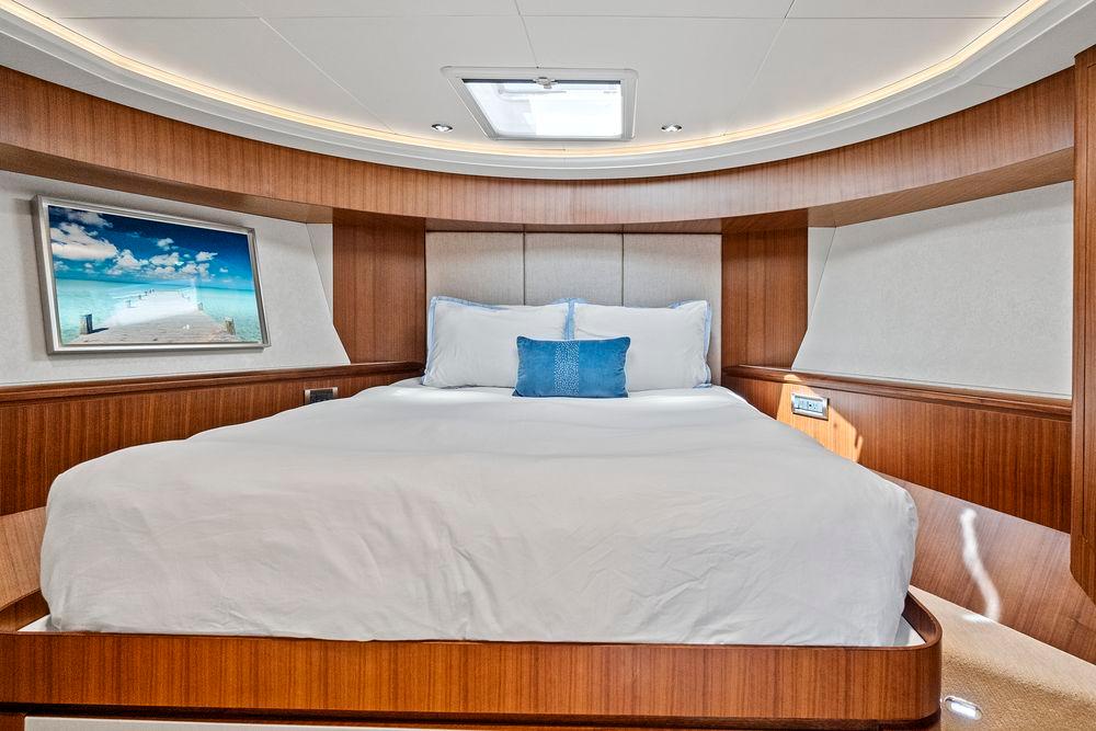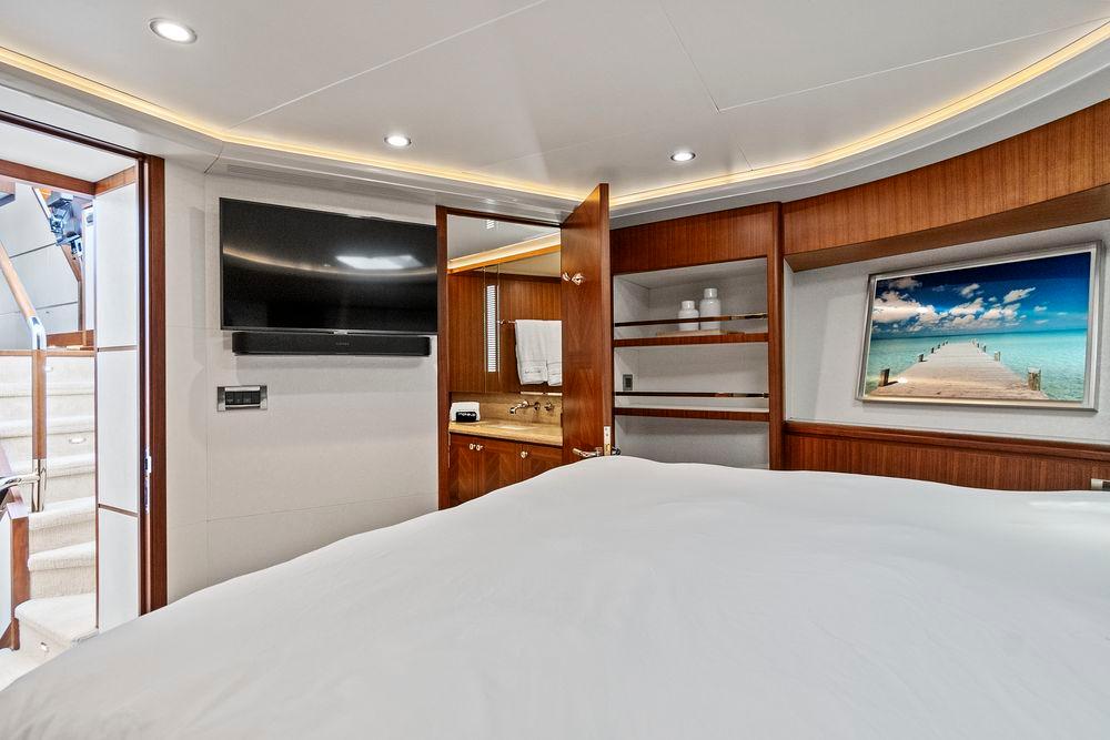 Entering from a set of automatic sliding salon doors you truly enter one of the many “Wow Factors” this yacht presents. Immediately you are taken back by the large windows that run the entire length of the vessel and pours in natural light and gives amazing exterior views. Turn to the port side, there is a brand new rising and falling flat screen smart TV. Forward of the that on the port side are two brand new barrel chairs that sit directly across from an extra-large and comfortable L-shaped couch and coffee table. Moving forward through the salon we come to a large dining table for eight, accompanied by a bar setup for making fresh cocktails, that features ample under counter storage, wine fridge, glass storage, and another sink disposing fresh drinking water that is processed through the vessels water purification system. Finally, one of the salons unique features is the Day Head under the bridge stairs and storage lockers that seem to blend right in to the wall. On a final note, it is important to express how everything in this area has been addressed in the recent refit in 2024.