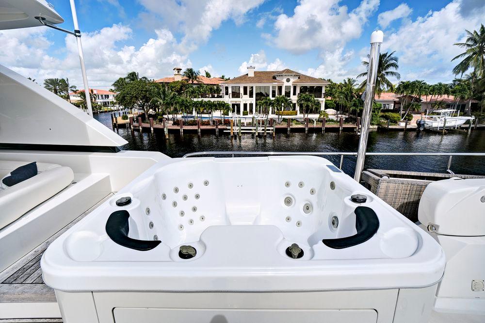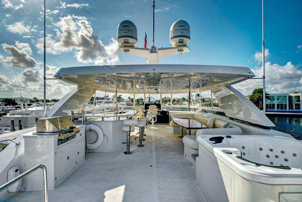 Number 3 on the “Wow Factor” and sure to be the best of the 3 is the Fly-Bridge. Front to back this area is like an adult playground and offers massive entertaining space and storage for tenders and toys. Beginning aft, is a hydraulic davit that will deploy your tenders for a day of exploring on the water. Once the tenders are cleared, you and your guests have ample space for sunbathing or gathering for sunset cocktail’s. Just forward is a full-size Jacuzzi and across from the Jacuzzi is a custom-built BBQ that can grill for many guests at once vs other brands, that offer small inefficient electric griddle tops. Once you enter the underside of the massive hardtop you are welcomed with a large bar area with seating. Opposite of the bar is a large u-shape seating are with more seating forward for lounging. To the Port side forward there is a glass door that grants access to the lower level of the vessel. The upper helm station is another upgraded "Mission Control" with duplicate features that are down below in the pilot house. In addition to this amazing space, it shall be noted that everything on the flybridge is new from upholstery, canvas enclosure, to appliances at the bar including a 4th and final fresh water drinking dispenser at the bar sink.