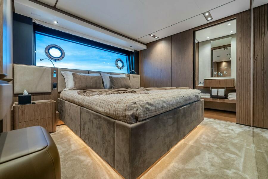 The master cabin on the main deck is accessed via the starboard side companionway just forward of the dining room. Upon entry there is a small seating area with a walk-in closet. The king bed is centreline, facing forward, with built-in cabinetry to port and starboard and a small vanity desk on the port side. There is wood flooring throughout the stateroom. At the front of the master is a full beam bathroom with private toilet stall to port, a shower to starboard, and his & hers sinks in between.